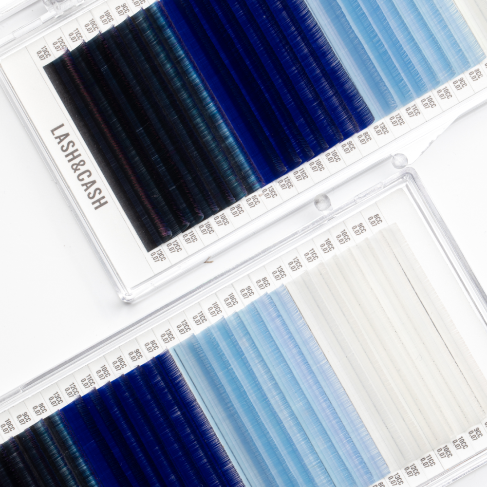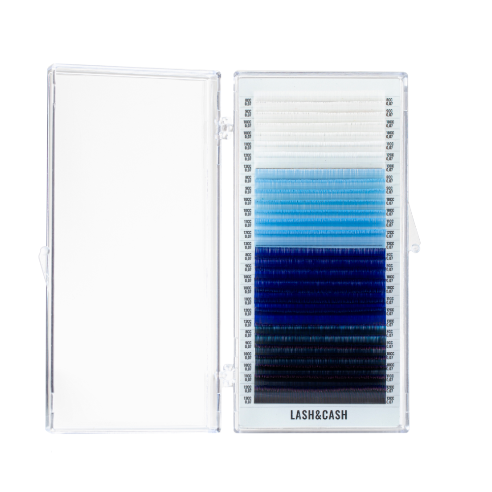 Paletka najwyższej jakości rzęs w chłodnych odcieniach jasnej szarości, niebieskiego i niebiesko-fioletowego, które pozwolą Ci uzyskać tajemniczy i wyrazisty wygląd.