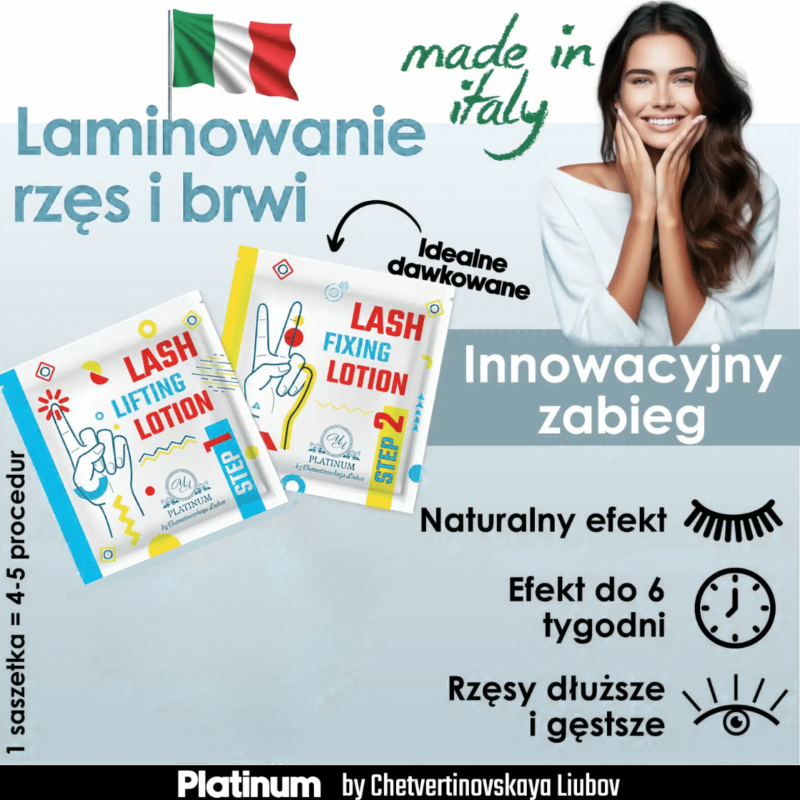 Profesjonalny zestaw w formie saszetek – dwa preparaty do laminacji rzęs i brwi zapewniające trwały skręt, odżywienie i połysk.Skład zestawu: